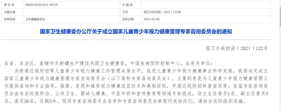 长沙晚报掌上长沙3月10日讯 据国家卫健委网站消息 3月9日,国家卫生健康委网站发布的“国家卫生健康委办公厅关于成立国家儿童青少年视力健康管理专家咨询委员会的通知(国卫办疾控函﹝2021﹞122号)”称,为提高儿童青少年近视防控等视力健康工作管理决策水平,促进全国儿童青少年视力健康事业科学发展,国家卫生健康委成立国家儿童青少年视力健康管理专家咨询委员会。