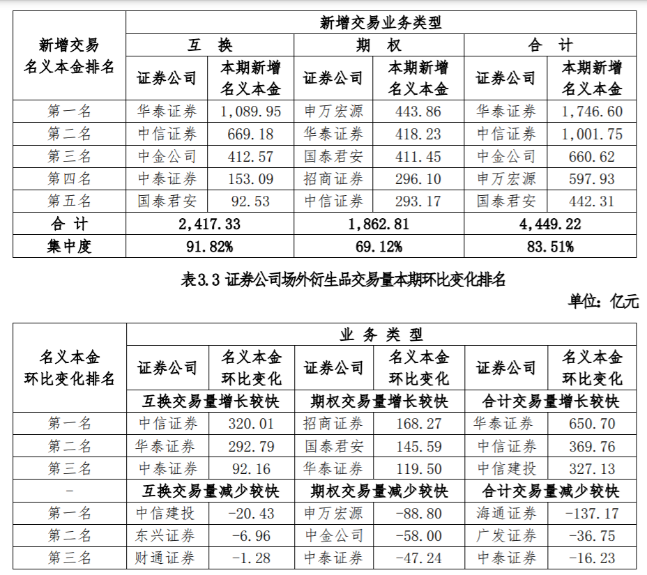 自2020年12月起,证券业协会暂停公布券商场外衍生品当月新增交易量排名,因此,券商中国选取2020年11月的券商排名情况。11月收益互换新增名义本金最高的五家券商分别是华泰证券、中信证券、中金公司、中泰证券和国泰君安。其中,华泰、中信、中金三家券商长期占据行业前三;场外期权新增名义本金最高的五家券商分别是申万宏源、华泰证券、国泰君安、招商证券和中信证券,申万、华泰、中信、国泰君安四家券商连续3个月出现在行业前五的榜单中。