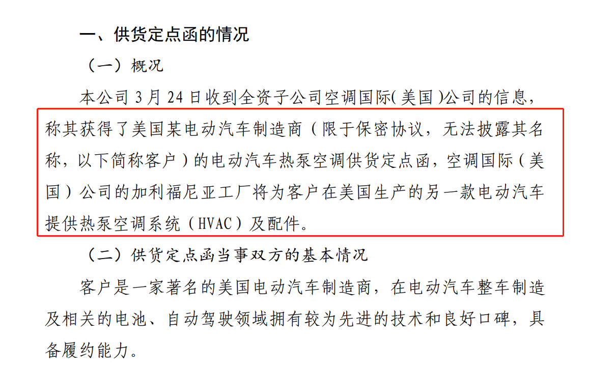 2020年3月25日,奥特佳公告表示,公司于3月24日收到全资子公司空调国际(美国)公司的信息,空调国际获得了美国某电动汽车制造商的电动汽车热泵空调供货定点函,空调国际的加利福尼亚工厂将为客户在美国生产的另一款电动汽车提供热泵空调系统(HVAC)及配件。