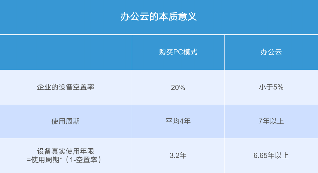企业设备空置率从20%降至5%以下,使用周期从平均4年提升至7年以上,最终可以计算出所有设备的真实使用年限:购买PC的模式为3.2年,而办公云的数值则能够达到6.65年以上。这意味着设备真实使用年限能够提高一倍以上,客户的使用成本也就有了更大的下降空间。