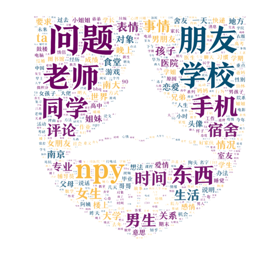 表白墙是反映大学生日常所见所闻、所思所想的镜子。通过抓取QQ帐号“南京大学表白墙”2019年10月至2020年11月的内容,分析其中的名词可以看出,从地点来看,宿舍、南大(学校)、食堂、医院、图书馆建构起学生的生活;从人物来看,“老师”“同学”最为常见,接着是“男生”“女生”“npy”(女朋友、男朋友的拼音缩写)。再后是“姐妹”和“兄弟”。