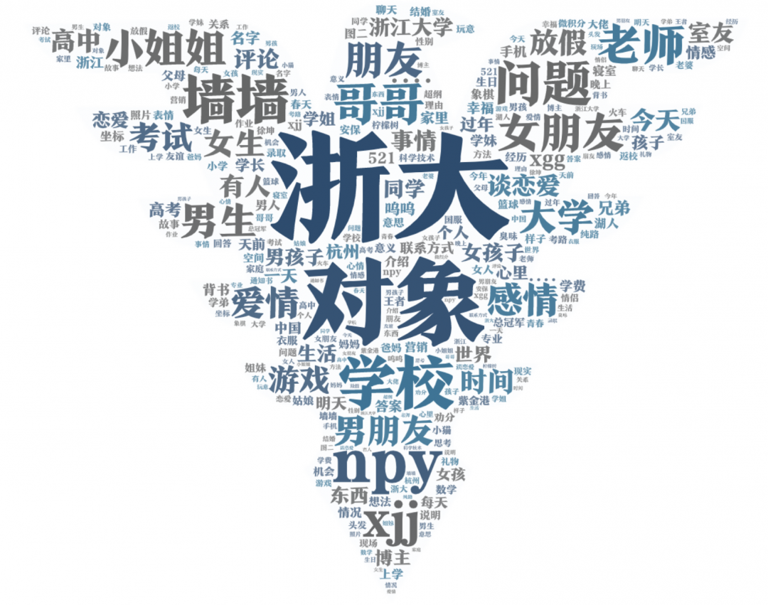 用同样方法,我们找到中国科学技术大学和浙江大学的表白墙QQ账号,进行了词频处理。