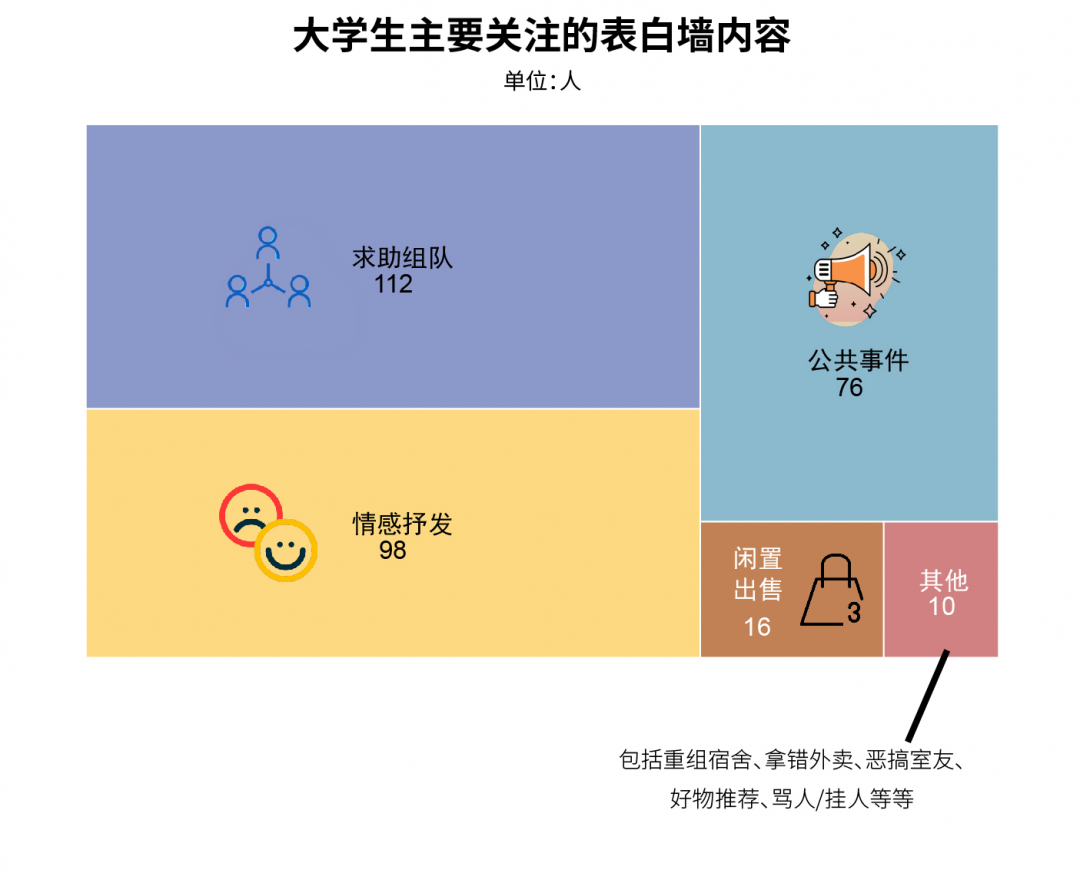 除了抒发情感和分享生活,“表白墙”还是一个虚拟的互助组织。同学们在表白墙上“求助组队”。通过问卷调查发现,“表白墙”是学生们在学习和生活中的互助分享平台,“表白”只是其中的一部分,并非是望文生义的示爱狗粮聚集地。