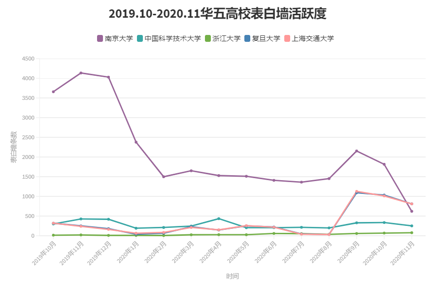 南京大学表白墙的月发稿量长期破千,甚至可以达到一月4000条以上。同样使用QQ空间的中科大表白墙,月活跃度在300左右,而浙江大学从未破百。