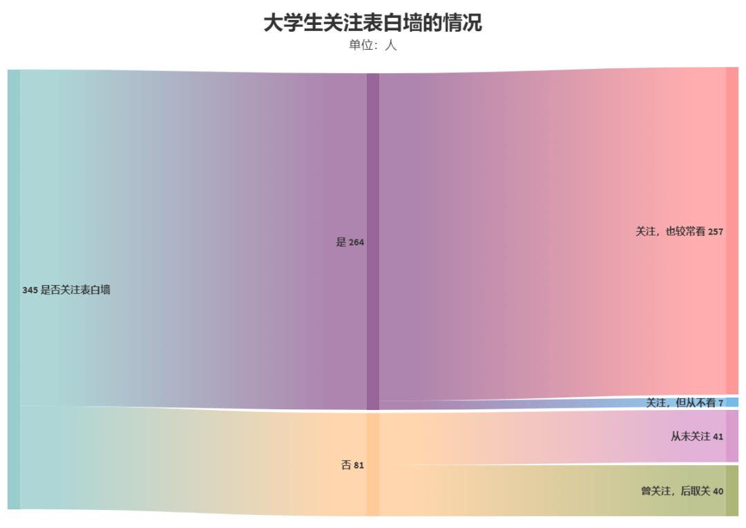 7位同学关注了表白墙,但从不阅读,更有约1/3大学生不关注表白墙。在这些不关注表白墙的同学中,有一半曾关注过。