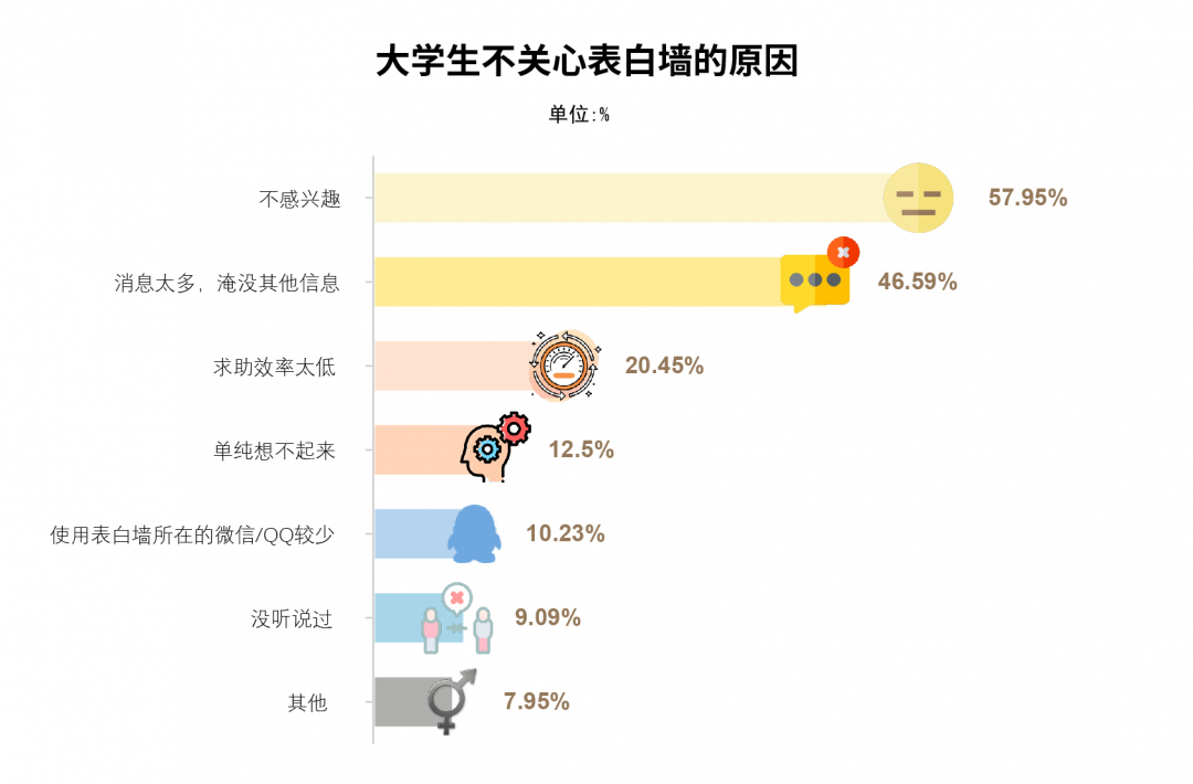 近六成同学取关“表白墙”的原因是“不感兴趣”,认为不值得投入过多时间去观看他人的日常生活。也有人认为,投稿过多淹没了其他信息、求助效率不高。