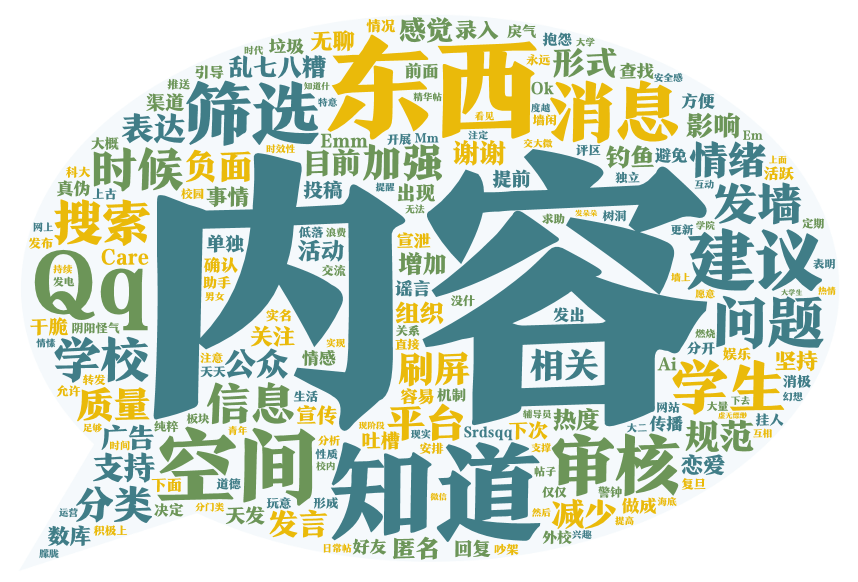 在问卷调查中,有近百位同学提出对表白墙的改进建议,主要是内容优化,呼唤“把关人”。不仅要让表白墙作为一个表达的渠道,更需要承担作为一个媒体平台的责任,不能什么都发。大学生希望表白墙加强筛选和审核机制、减少刷屏、核实谣言、提升质量。