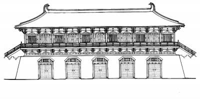 进入中古时期至明清北京城,部分朝代的都城与皇城、宫城之正门出现了“一门五道”的形制,如唐长安城外郭城“明德门”、大明宫“丹凤门”、北宋东京城皇城宣德门、金中都宫城应天门、元大都宫城崇天门、明清北京城皇城“天安门”。