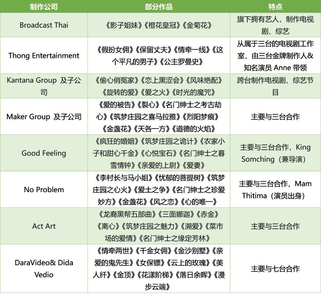 以影视制作公司为主的合作模式,主要是指有完整产业链条的大型影视制作公司比如GMM、True,其业务涉及制作、发行、播出等各个环节,采用生产、播出一体化的模式,如 GMM旗下拥有GMM25台和One HD31 台,能够形成自产自销的闭环。