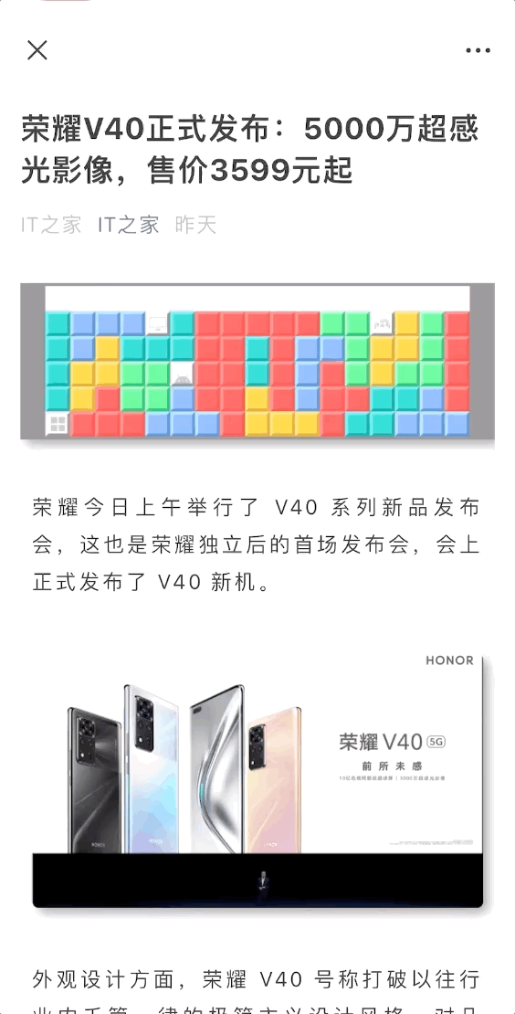 微信 8.0 中,将微信文章设置浮窗后,不再占用主页空间,而是统一收纳在负一屏,并生成标签,用户可通过点击首页顶部左侧的两个小点或向右滑动页面进入负一屏,查看所有的文章标签,点击标签即可继续阅读,点击左上角的叉号即可关闭。对了,负一屏收纳同样也支持小程序浮窗。