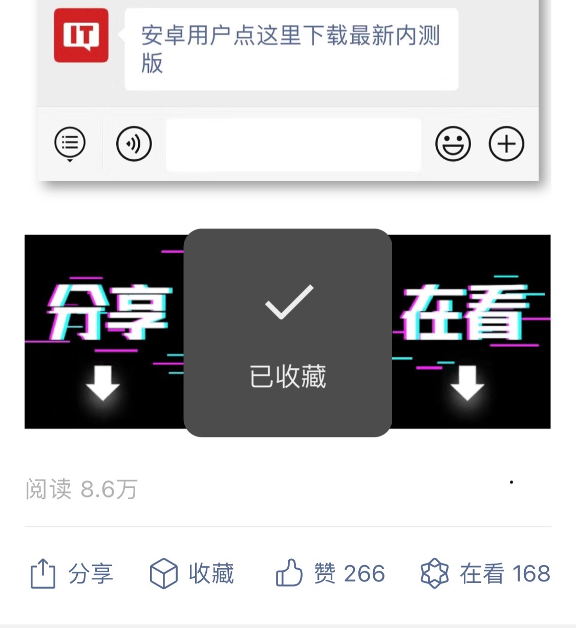 现在,当我们看到一篇喜欢的文章,想把它加入收藏时,只需要下拉到文章末尾,直接点击这里的收藏按钮即可;