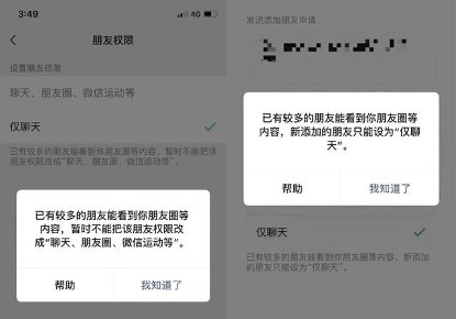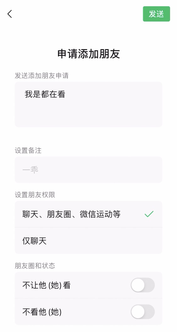 现在只要添加好友,就必须在申请页面设置好朋友和朋友圈权限,这一步大大加强了社交分级化的属性。
