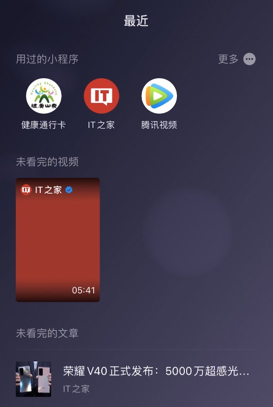 以前下拉小程序菜单会展示所有使用过的小程序,但现在只会将最近使用的 7 个小程序图标排列在顶部,而下面空出的部分则会展示你看过的直播,未看完的文章、视频,正在听的歌等等。