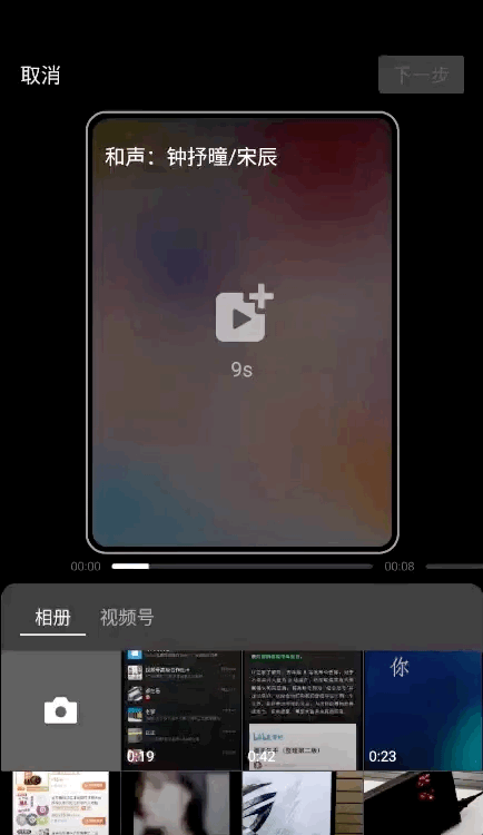 而点击右下角的创作音乐视频,还能直接用这首歌创作一个朋友圈短视频或者视频号视频。滑动上方的方块选择音乐片段,每个音乐片段对应一个画面,且画面时长需要和所选音乐片段长度保持一致。