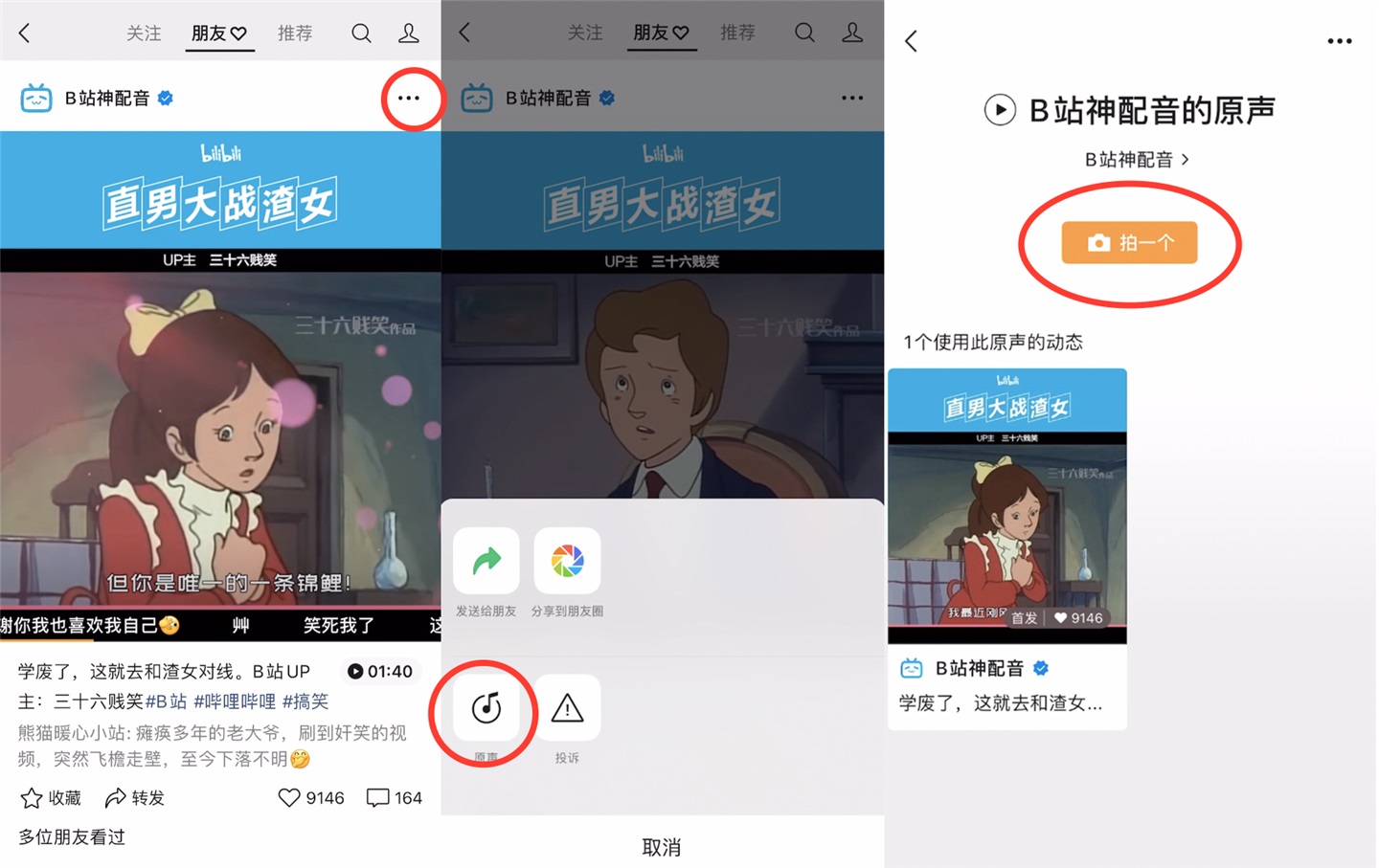 打开视频号之后,右上角的 “…”菜单中,新增了一个原声选项,点进去之后可看到同款 BGM 创作的所有视频,你也可以选择顶部的拍一个按钮,自己创作同款歌曲的视频号视频。