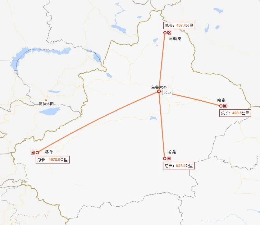 从自治区首府乌鲁木齐到西部重镇喀什直线距离约1078公里,比北京至武汉的直线距离还要远。乌鲁木齐到东部门户哈密直线距离也将近500公里,比武汉到南京的直线距离还远。乌鲁木齐到北部的阿勒泰市也有约437公里,比郑州到西安的直线距离还远。乌鲁木齐到南边的若羌直线距离也有约537公里。