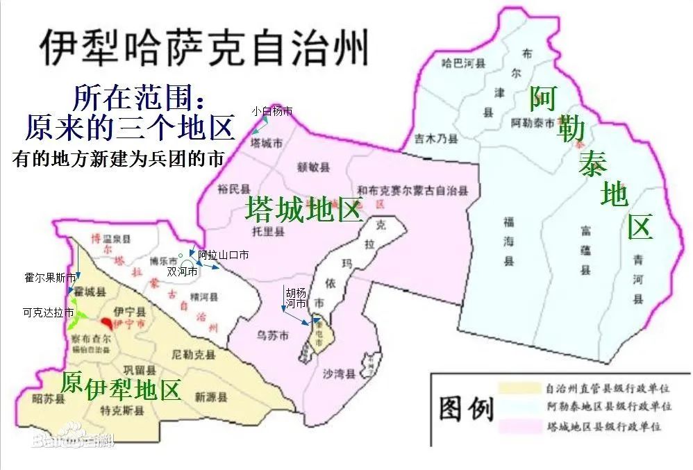 因为是多民族聚集区,新疆的行政区划也较复杂。新疆维吾尔自治区下辖的副省级伊犁哈萨克自治州直辖11县市、管辖塔城地区和阿勒泰地区。新疆维吾尔自治区还下辖昌吉回族自治州、巴音郭楞蒙古自治州、博尔塔拉蒙古自治州和克孜勒苏柯尔克孜自治州,自治区管辖乌鲁木齐市、克拉玛依市、吐鲁番市和哈密市,还有喀什地区、和田地区和阿克苏地区。另外,还有一个由中央和自治区双重领导的新疆生产建设兵团。