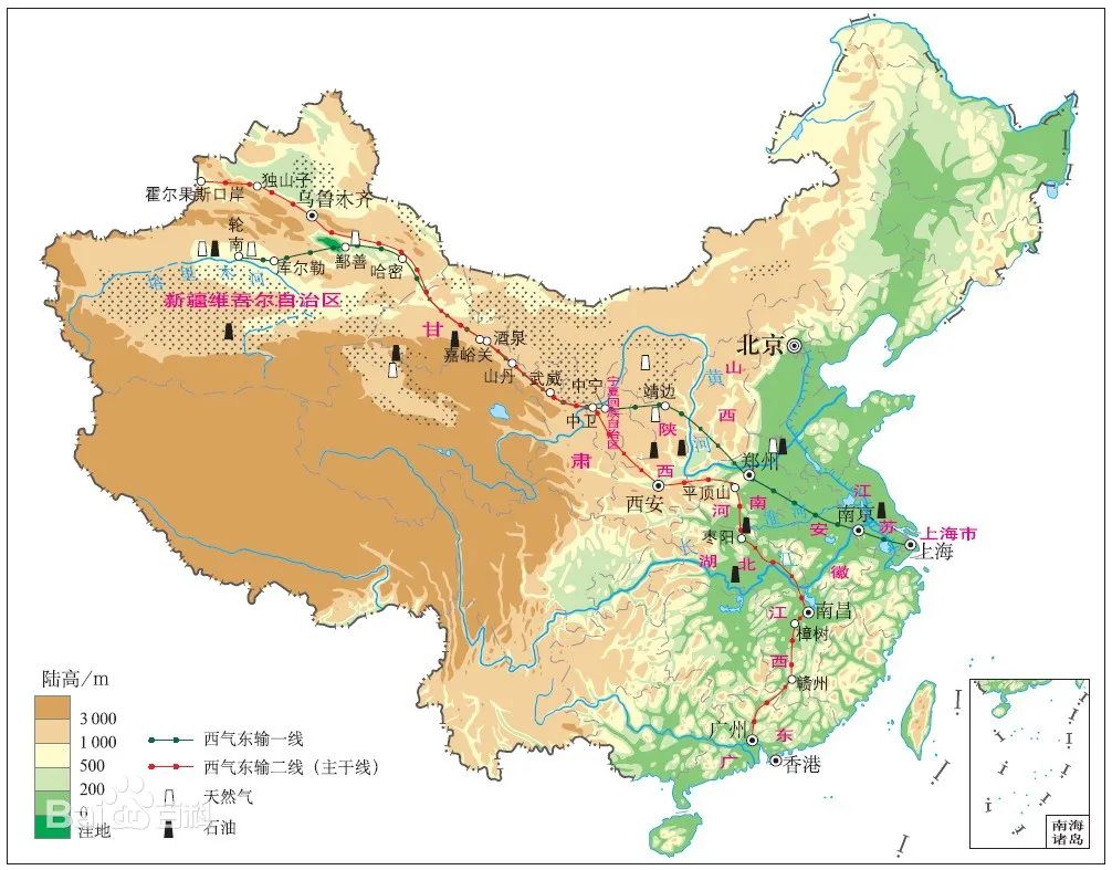 南疆塔里木盆地里的塔里木油气田,是现在中国油气生产的主力军,其中的轮探1井钻探深度已达到8882米,比珠穆朗玛峰的高度还高。西气东输一期的起点就是塔里木盆地的轮南。