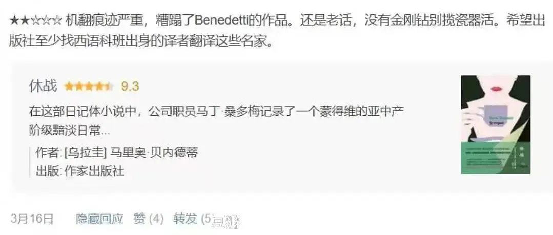3月16日,当豆瓣用户高晗为新近出版的西语译著《休战》打出“两星差评”的时候,她恐怕不会想到,这件随手而为的小事,会在不久之后给她带来巨大的麻烦。当时,在大学里修读西班牙语的高晗,在读过《休战》之后,发现该书翻译水平远低于预期,于是在豆瓣留下了这样一段评语:“机翻痕迹严重,糟蹋了作者的作品,还是老话,没有金刚钻别揽瓷器活。”