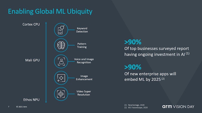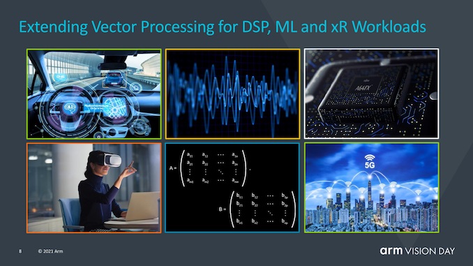 机器学习也被视为 Armv9 的一个重要部分,因为 Arm 看到未来几年越来越多的 ML 工作负载将变得普遍。在专用加速器上运行 ML 工作负载自然仍然是性能或能效关键的要求,然而,仍然会有大量新的较小范围的 ML 工作负载采用,这些工作负载将在 CPU 上运行。
