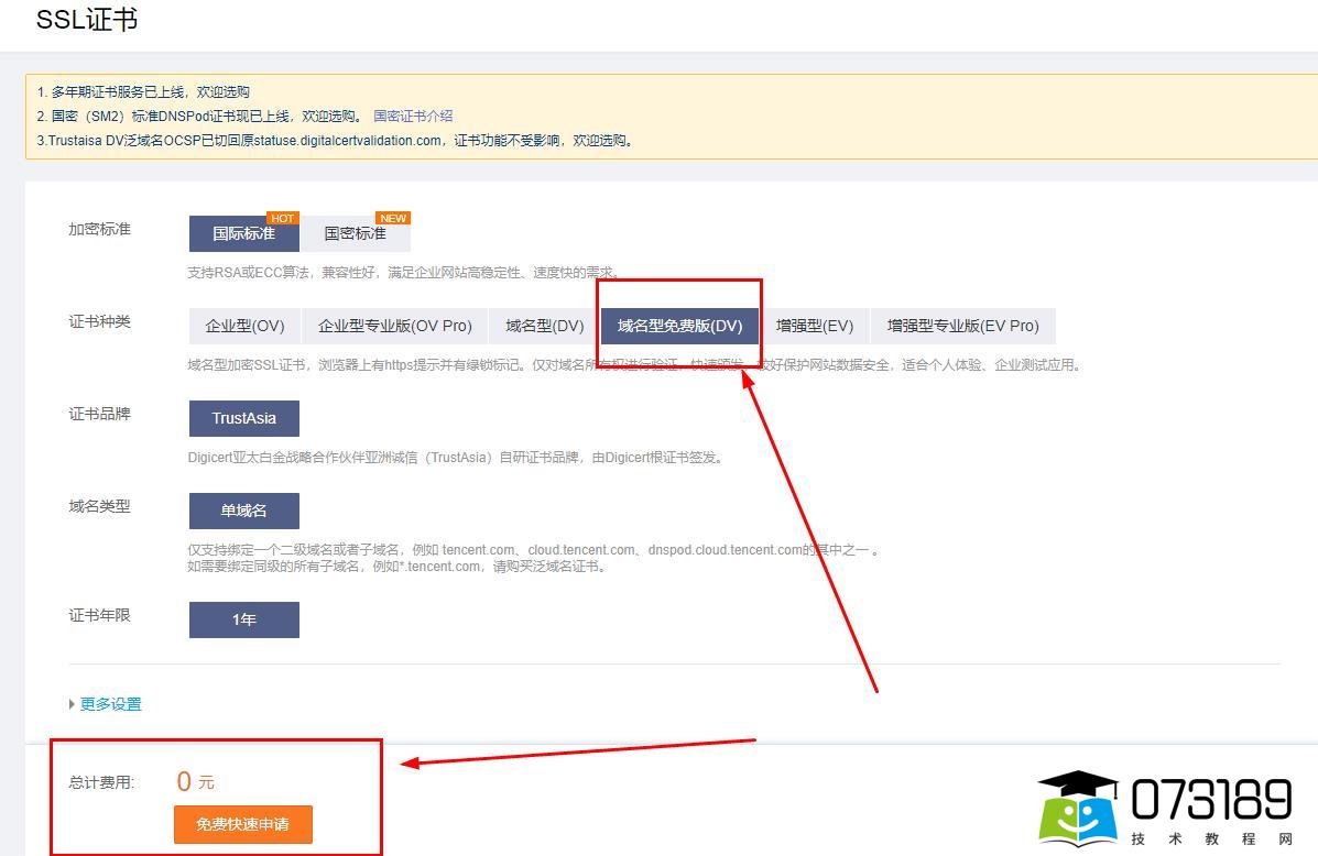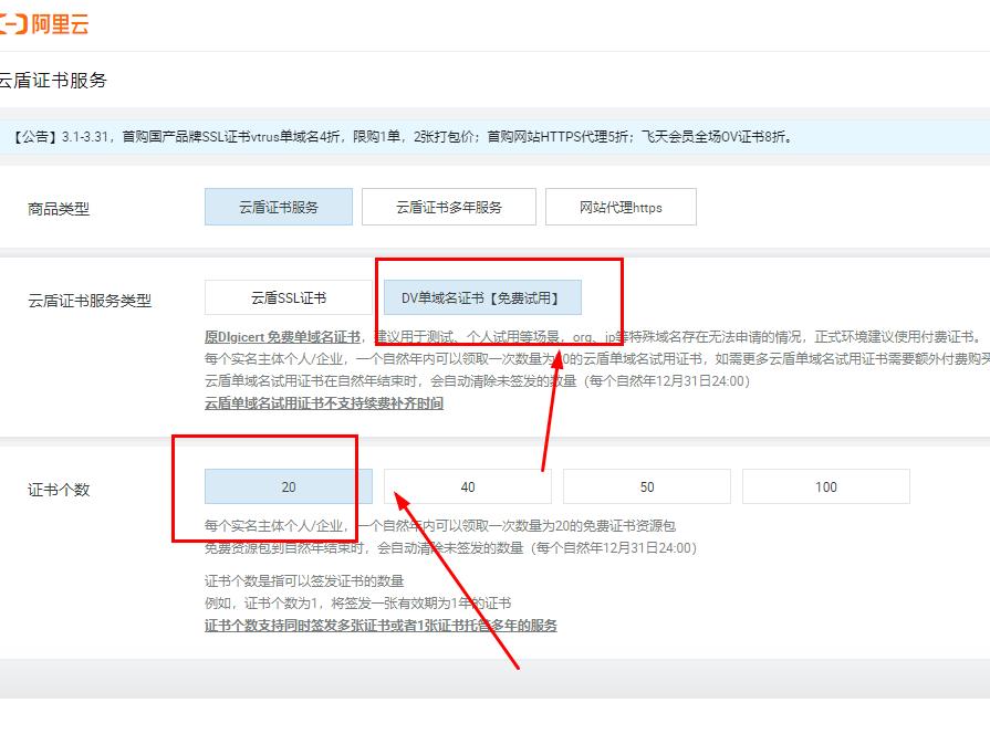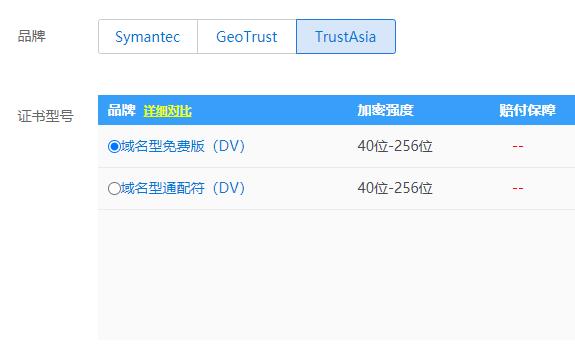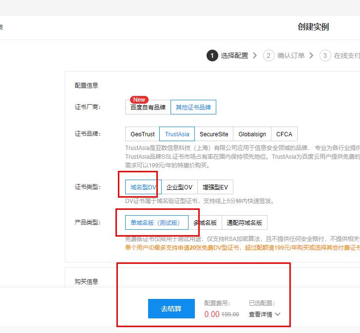 在搜索框输入“ssl”,点“搜索”按钮出来搜索结果后,点“立即购买”点“DV单域名证书【免费试用】”,然后购买即可。