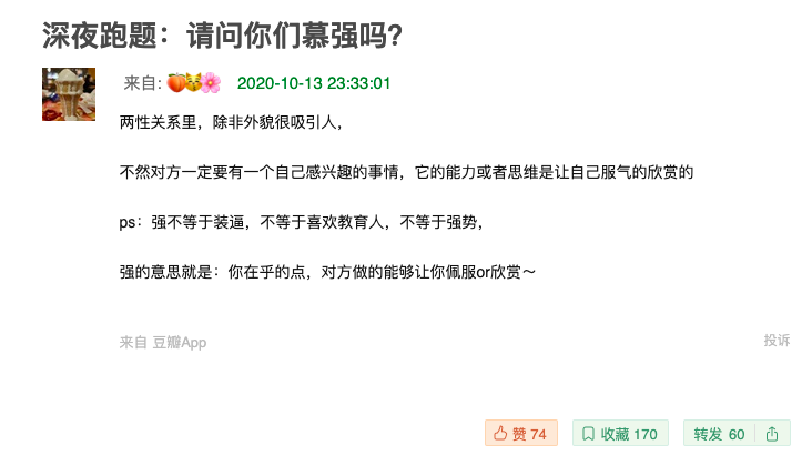 继续浏览后发现许多人都表明自己在亲密关系中有很强的“慕强”心理,就喜欢那些比自己优秀很多的人,而对于那些没那么优秀但对自己很好的人,却不会有感觉。