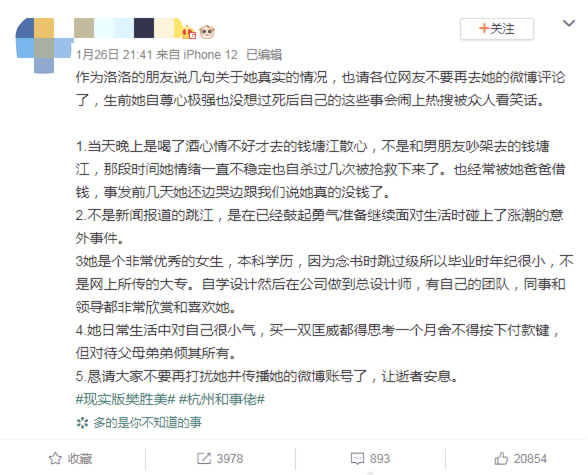 2020年10月17日凌晨,钱塘江涨潮,洛洛与男友闹矛盾后去江边散步,不幸被江水卷走,事后,传出“跳江”的消息。但警方称,从监控判断,洛洛不属于自杀,属于意外。