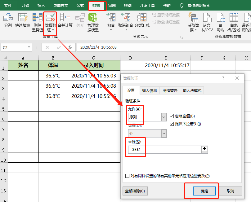 在数据验证窗口【设置】页面中,允许选择【序列】,来源中输入:=$E$1 ,也就是我们上面无关的单元格,最后点击【确定】按钮返回工作区。