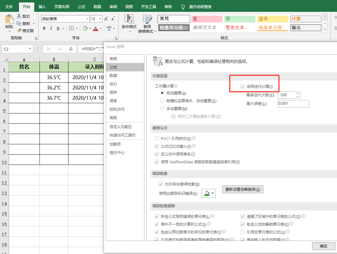 点击【文件】-【选项】调出Excel选项窗口,点击【公式】页面,在计算选项中勾选【启用迭代计算】,最后点击【确定】返回工作区。