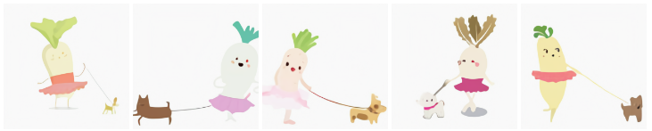 文本提示:穿着芭蕾舞短裙的萝卜宝宝在遛狗。