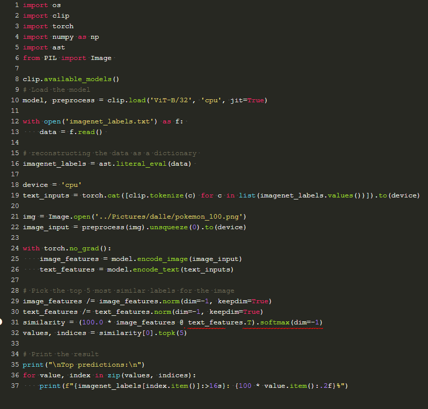 为了在Notebook生成的图像上使用Imagenet标签评估CLIP,Steves使用经修改后的CLIP github中的以下代码来处理此问题: