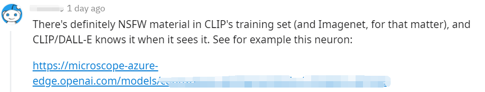 而在Reddit上有一位网友表示:“CLIP的训练集中肯定有NSFW材料(就此而言,还有Imagenet),一旦CLIP / DALL-E看到它就能识别。”