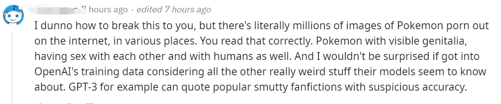 “我不知道该怎么告诉你,但是在互联网上有着数以百万计的Pokemon色情图片。你没看错,互联网上有很多具有明显xx器官的Pokemon互相发生xx关系的图片。所以说这些数据集很有可能被OpenAI自动爬虫收集到训练数据中,我也不会对此感到惊讶,例如,GPT-3可以引用流行的淫秽粉丝小说,其准确度高到令人质疑。”