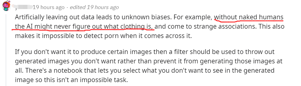 还有一位网友立刻留言说出了真话:“OpenAI为这些大模型获取足够多数据的唯一方法就是自动将其从互联网上搜刮下来,然鹅互联网上有很多防不胜防的色情内容。”