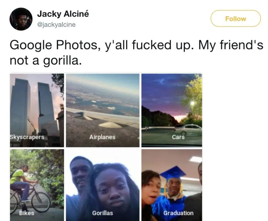 在遥远的2015年,一黑人哥们Jacky Alciné震惊地发现,自己被Google图像识别算法歧视了:Google Photos竟然把他的朋友分类成了“大猩猩”(gorilla)!