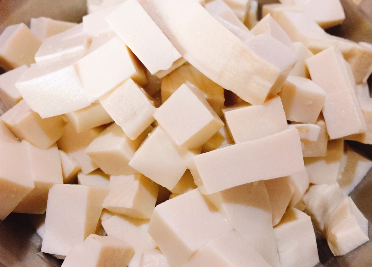 用刀把豆腐切成小块,切好的豆腐装入大碗中