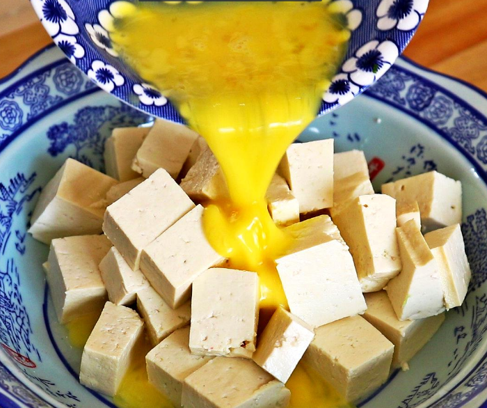 2.豆腐加入鸡蛋液,口味更滑嫩好吃。