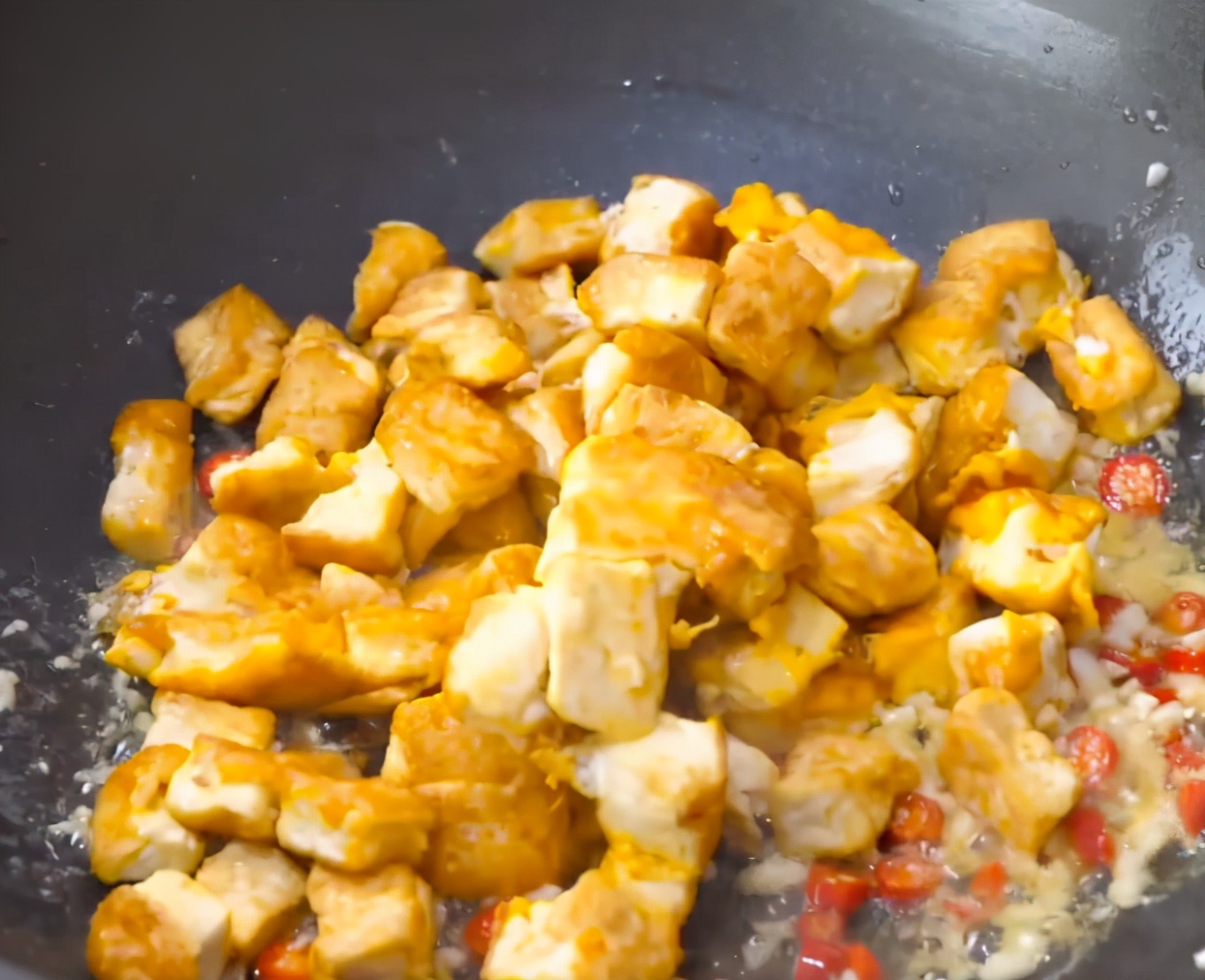 翻炒15秒,翻炒均匀后倒入调好的料汁,烧3分钟,把豆腐烧至入味,3分钟后,把韭菜下入