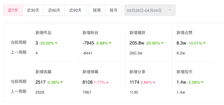 在抖音,最近一周他掉了453个粉丝。在B站大本营,则是更加惨烈的一周掉7945个。当然,对于大博主来说,这种程度只是洒洒水啦。一周掉8000,速度恒定的话一个月才掉3万2。比起年初一周掉粉4万的盛况,现在这种速度已算“止血”了。