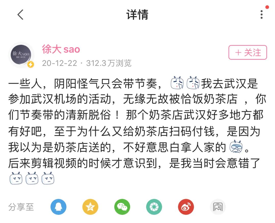 拐点出现在2020年初的诈捐事件,2月7日晚徐大SAO发布视频《做好防护,走出家门,大SAO为远方的朋友做了一顿特殊的炸鸡腿》,并宣布将该视频的全网收益,捐给李文亮医生家人。