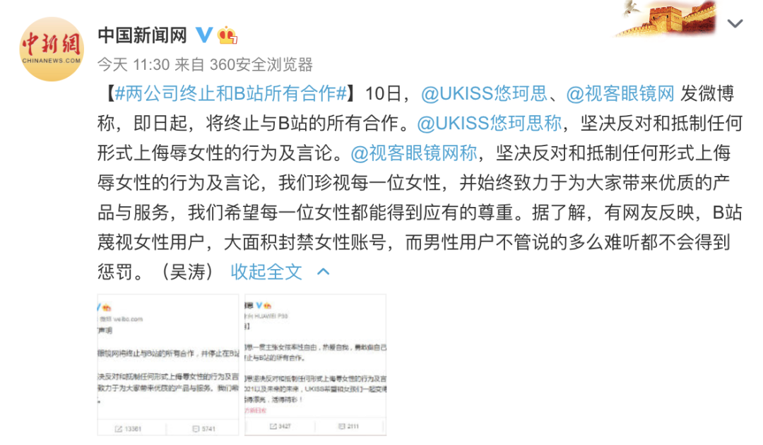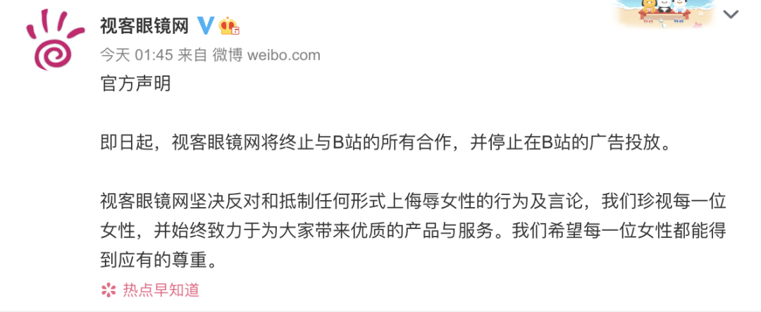 此前,@视客眼镜网 曾发布微博,表示将终止与B站的所有合作,并停止在B站的广告投放。