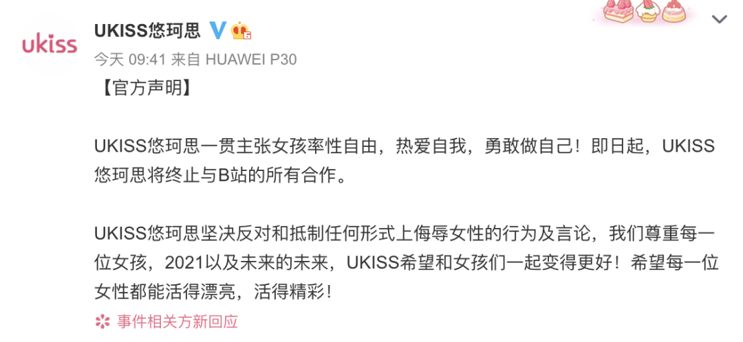 10日上午,@UKISS悠珂思 发表声明,称坚决反对和抵制任何形式上侮辱女性的行为及言论,并表示即日起,将终止与B站的所有合作。