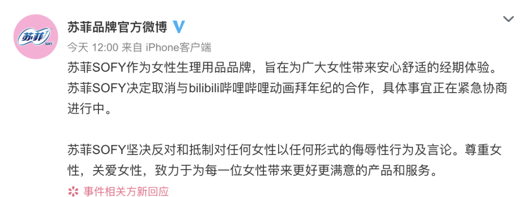 随后,@苏菲品牌官方微博 称,决定取消与bilibili哔哩哔哩动画拜年纪的合作,具体事宜正在紧急协商进行中。