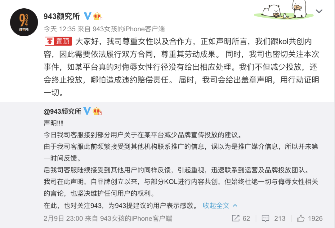 @943颜究所 也表示,如B站真的对侮辱女性行径没有给出相应处理,不但减少投放,还会终止投放,哪怕造成违约赔偿责任。