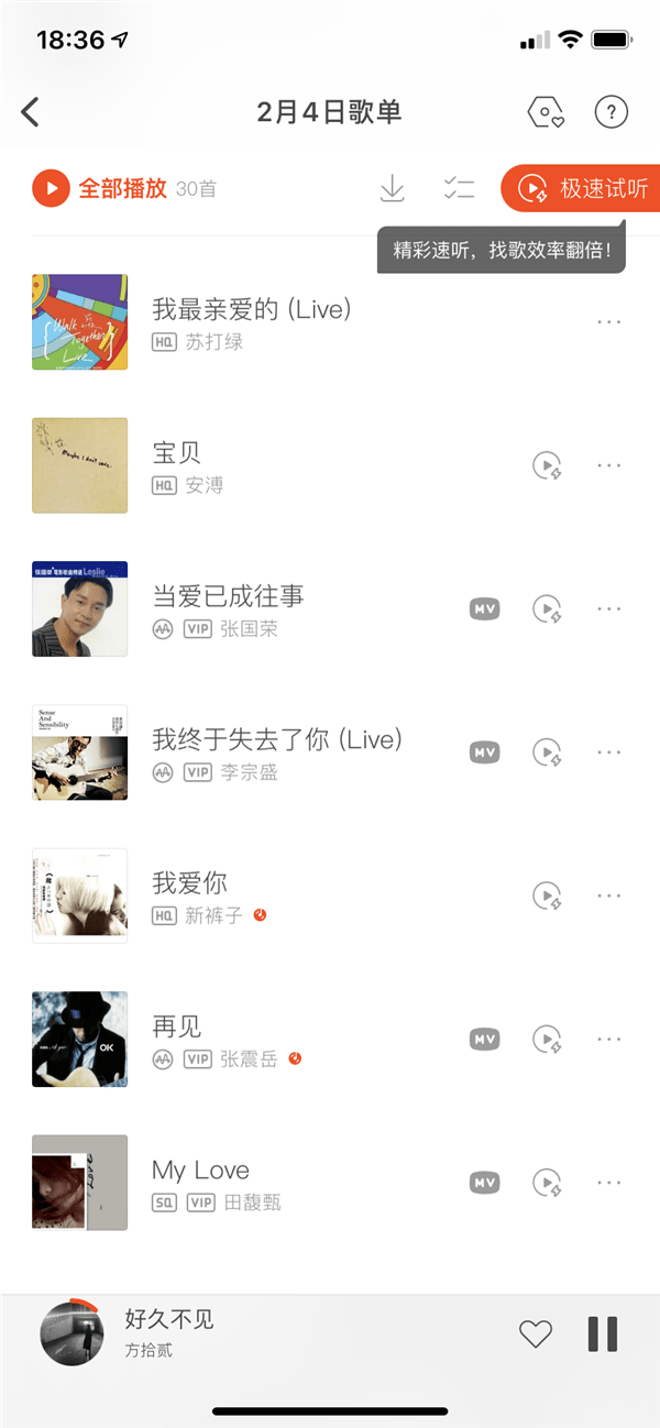 歌单中30首歌包括《温柔》《拥抱》《你一直在》《我终于失去了你》《我爱你》《当爱已成往事》《好久不见》《再见》等,歌名流露出满满的不舍与眷恋。