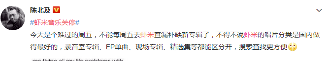 对此,微博音乐博主@陈北及 不禁感叹:今天是个难过的周五,不能每周五去虾米查漏补缺新专辑了,不得不说虾米的唱片分类是国内做得最好的,录音室专辑、EP单曲、现场专辑、精选集等都能区分开,搜索查找更方便。