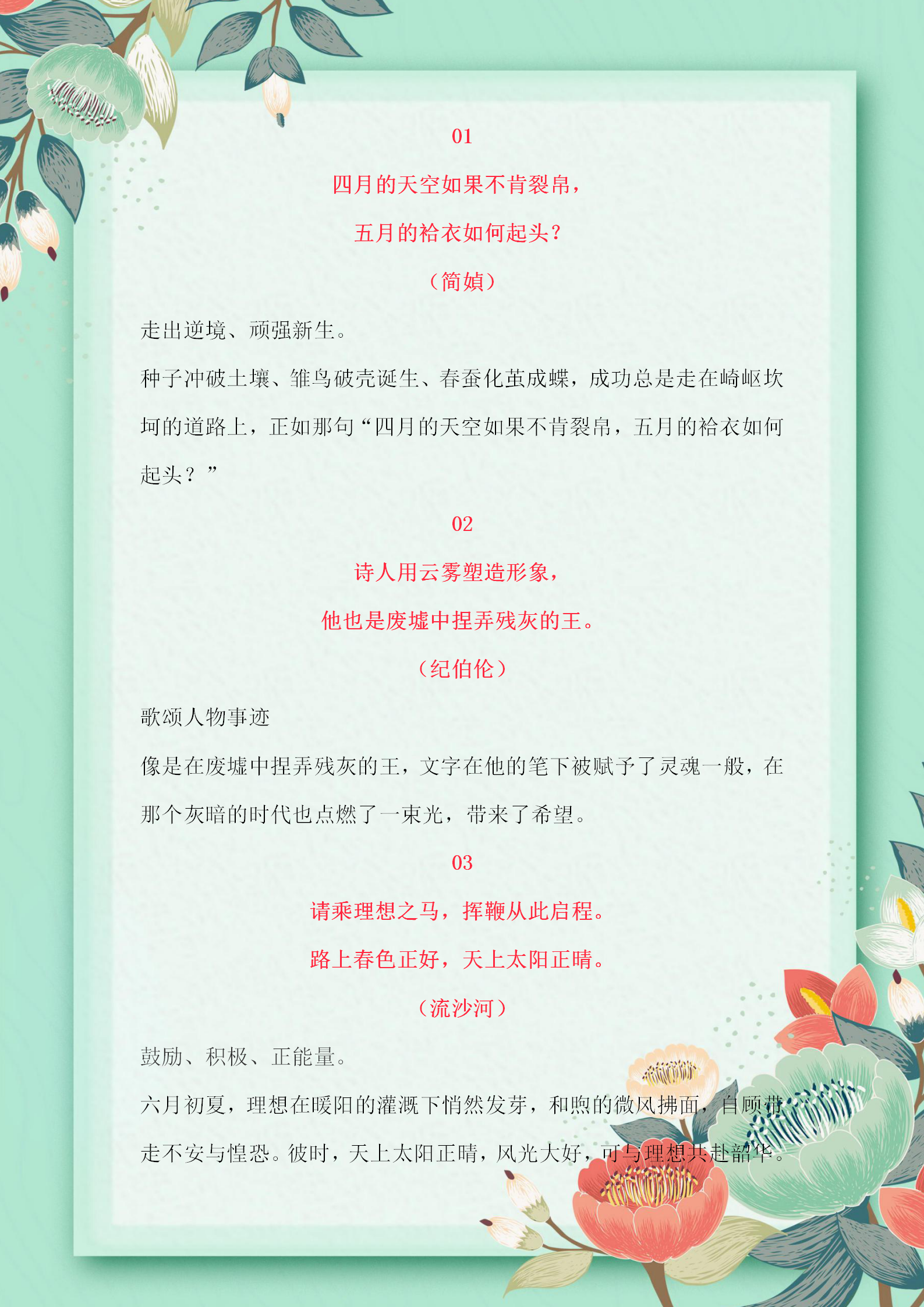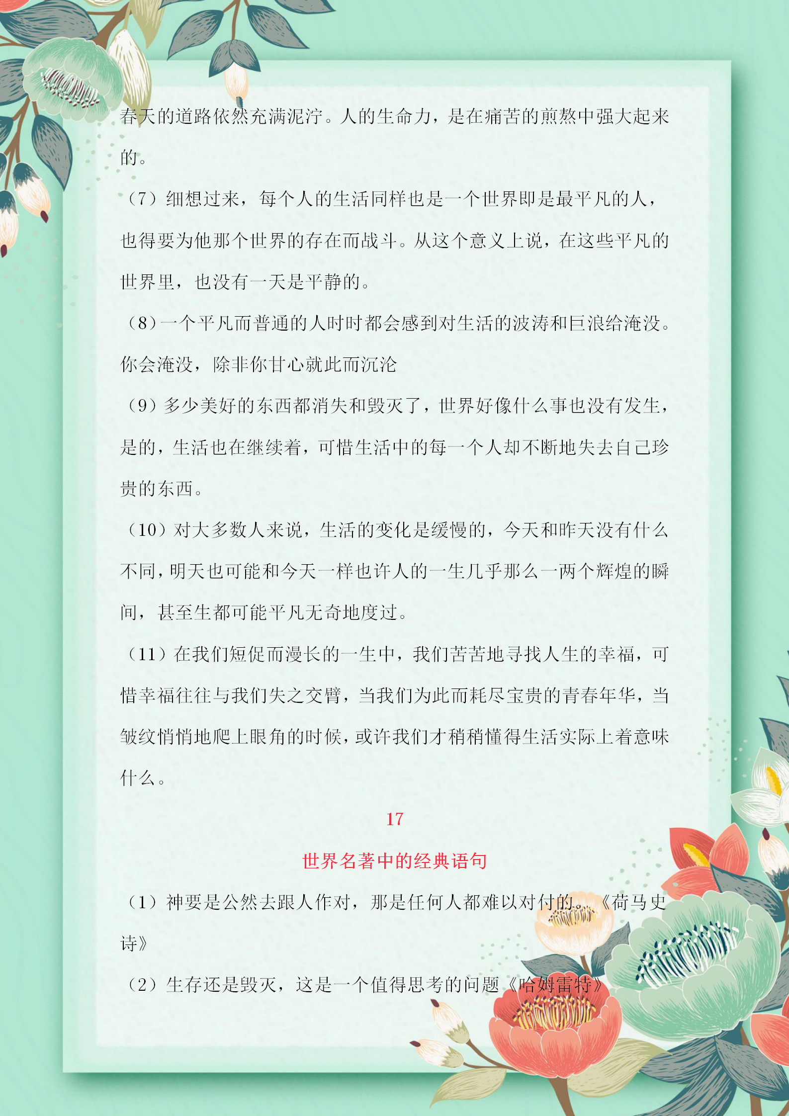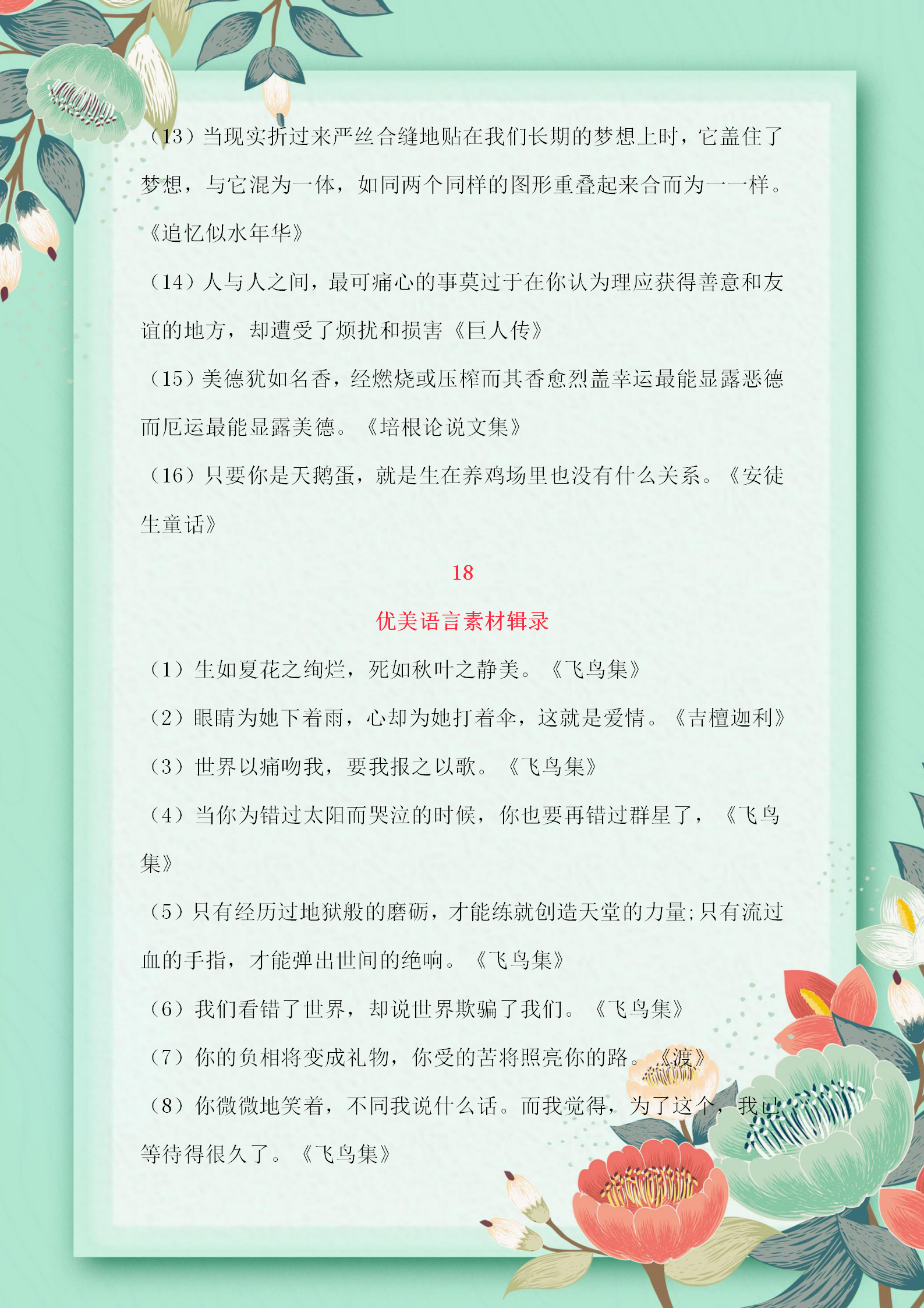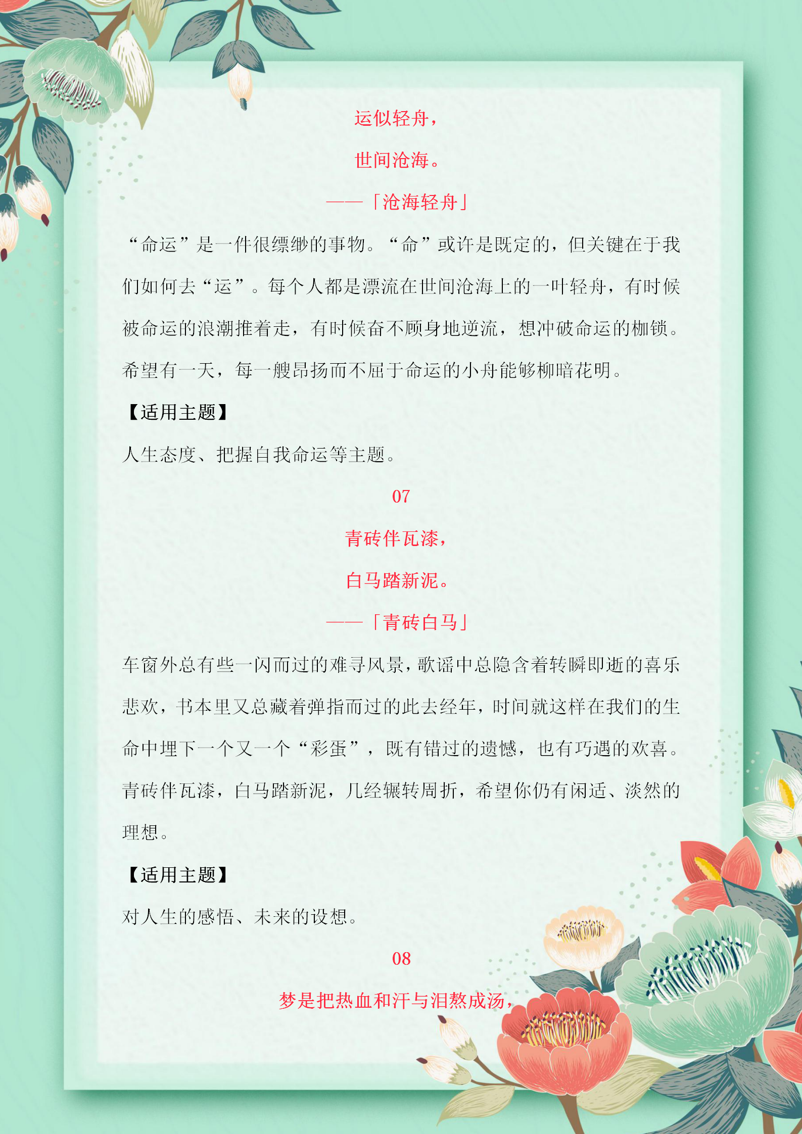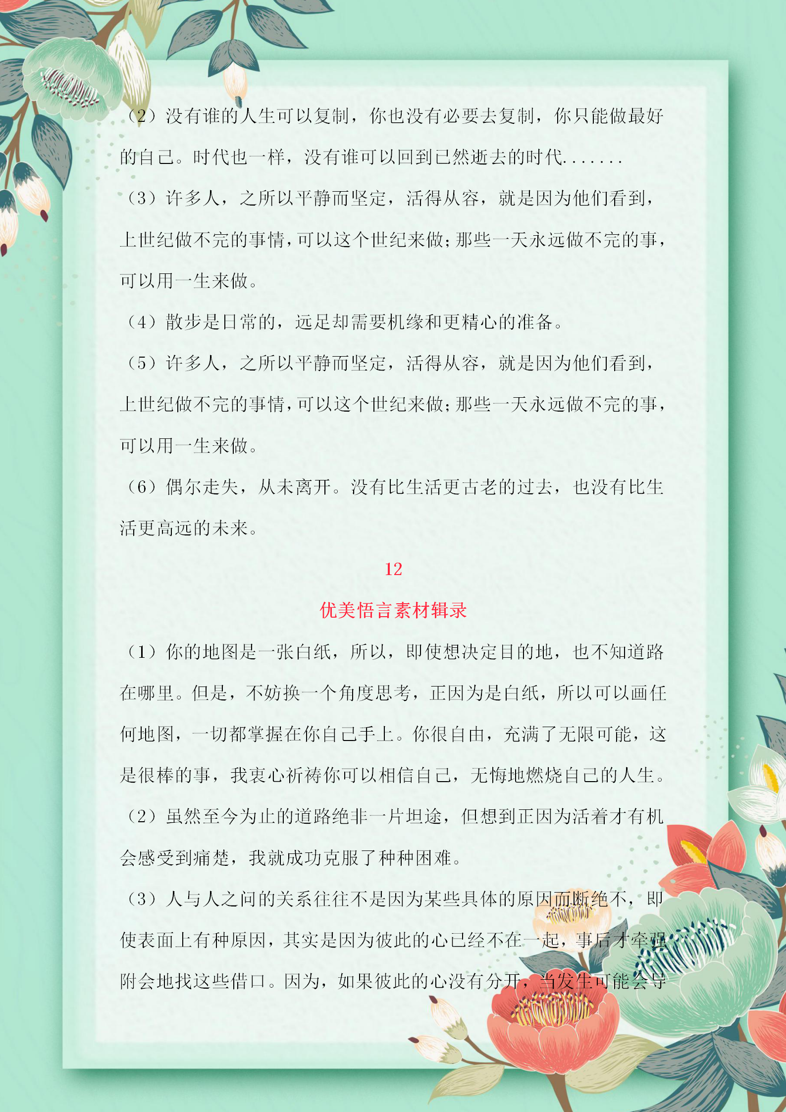 所以,同学们平时有时间就多做积累,今天呢,为了方便同学们积累作文素材,我们为大家分享以下这份100个金句积累作文素材大全,同学们可以收藏打印出来,把这些句子积累起来用在语文作文中,画龙点睛!