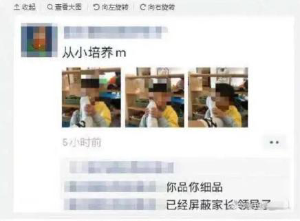 截图上发布者将自己的脚伸到男孩面前,发布朋友圈并配文称“从小培养m”,留下“你品你细品”、“已屏蔽家长领导了”的言论。