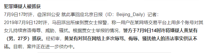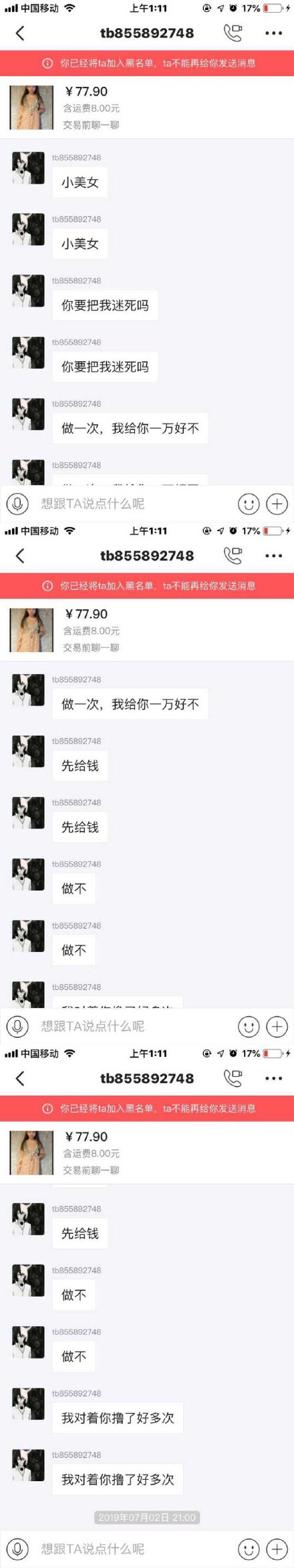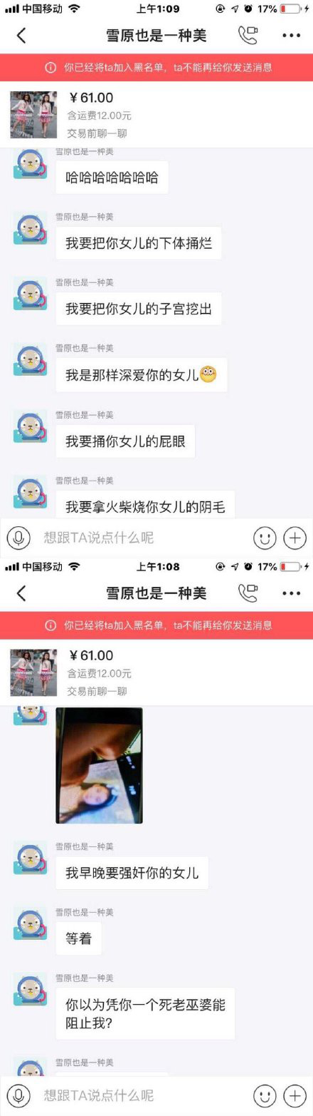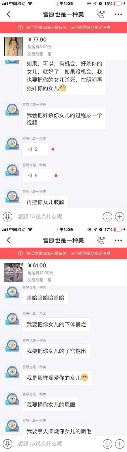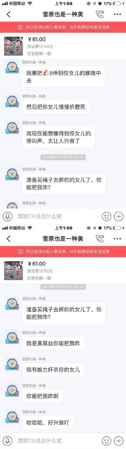 该女士将此用户拉黑后,此人又用多个账号对其骚扰,并威胁要将该女士的女儿“奸杀”。