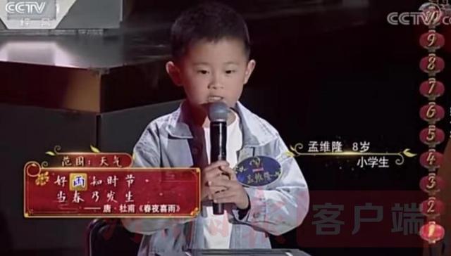 从当晚节目来看,本次节目赛程安排紧凑,赛制密度极大。不过,亮相央视节目现场的4名南阳小选手纷纷表示“不紧张”。在选手李佰聪和王子豪进行攻擂资格争取赛“飞花令”环节,8岁的孟维隆出镜,先后向李佰聪和王子豪现场挑战,从容地诵出“好雨知时节,当春乃发生”和“洛阳城里见秋风,欲作家书意万重”的诗句。